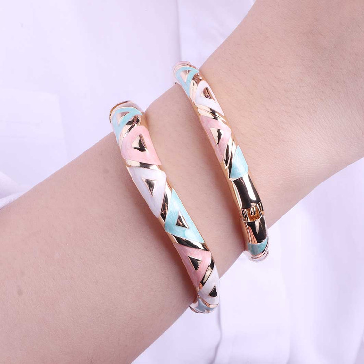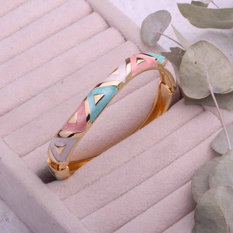 ین دستبند با الهام از رنگ های بهاری طراحی شده و ترکیب رنگ طلایی براق با سطح مینایی جلوهای بسیار ظریف و لوکس به آن داده است. طراحی آن بهگونهایست که هم برای استفاده روزمره مناسب است و هم در استایلهای رسمی جلوه خاصی ایجاد میکند.