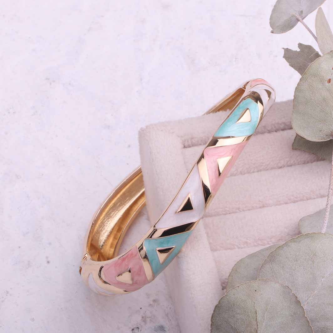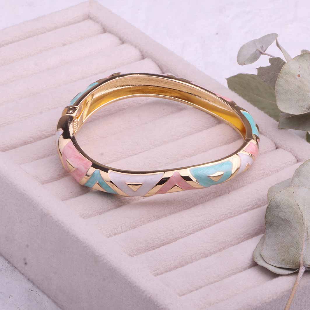 ین دستبند با الهام از رنگ های بهاری طراحی شده و ترکیب رنگ طلایی براق با سطح مینایی جلوهای بسیار ظریف و لوکس به آن داده است. طراحی آن بهگونهایست که هم برای استفاده روزمره مناسب است و هم در استایلهای رسمی جلوه خاصی ایجاد میکند.